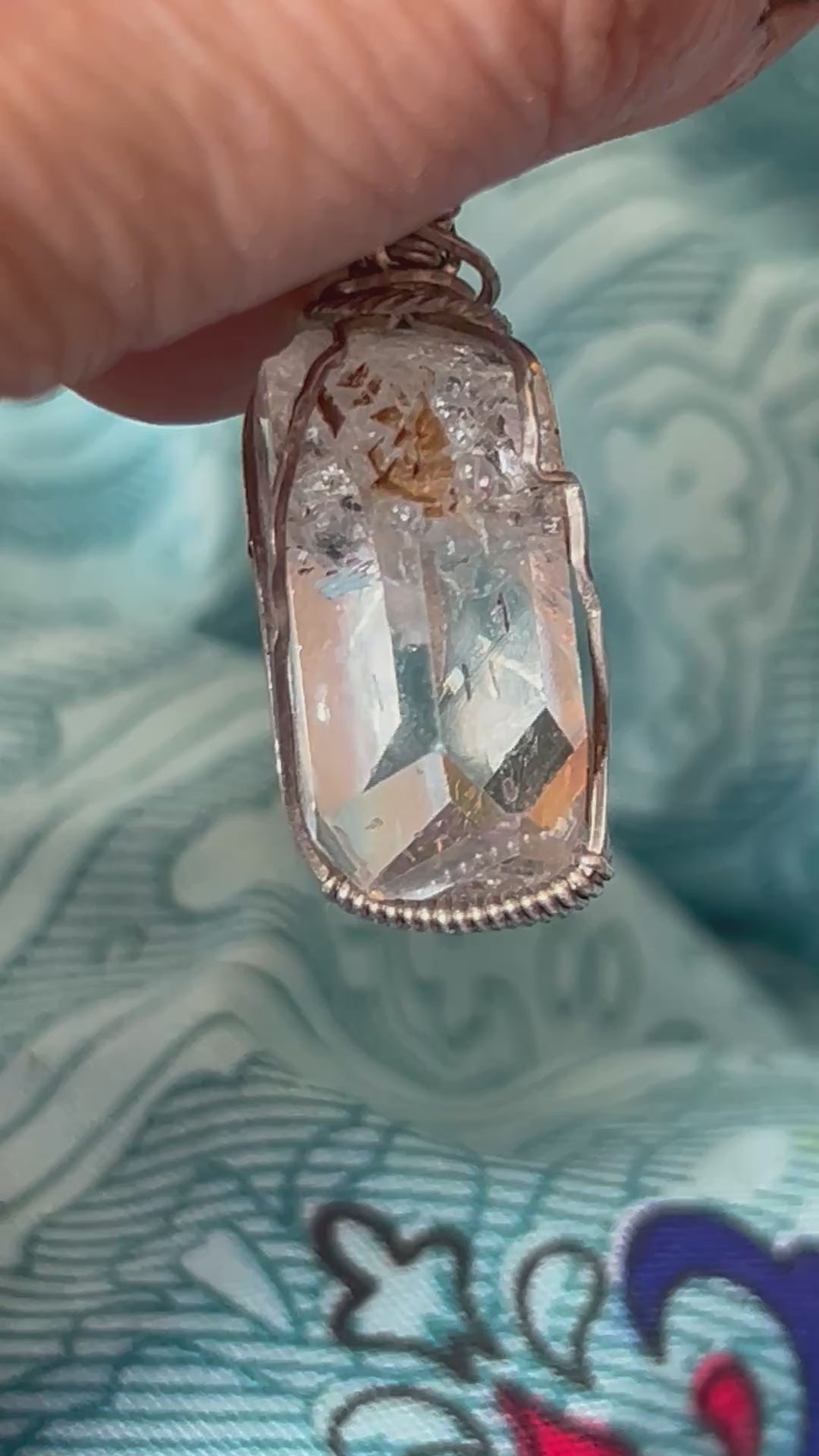 This unique specimen boasts a one-of-a-kind hawk nose Herkimer Diamond formation, exclusively hand-mined in Upstate New York during the 2024 mining season. Crafted with precision, this Herkimer Diamond is delicately surrounded by sterling silver wire. Known as the "attunement stone", it is believed to enhance mental clarity and promote harmony within the mind, body, and spirit. All pendants come with a 20 inch sterling silver snake chain.