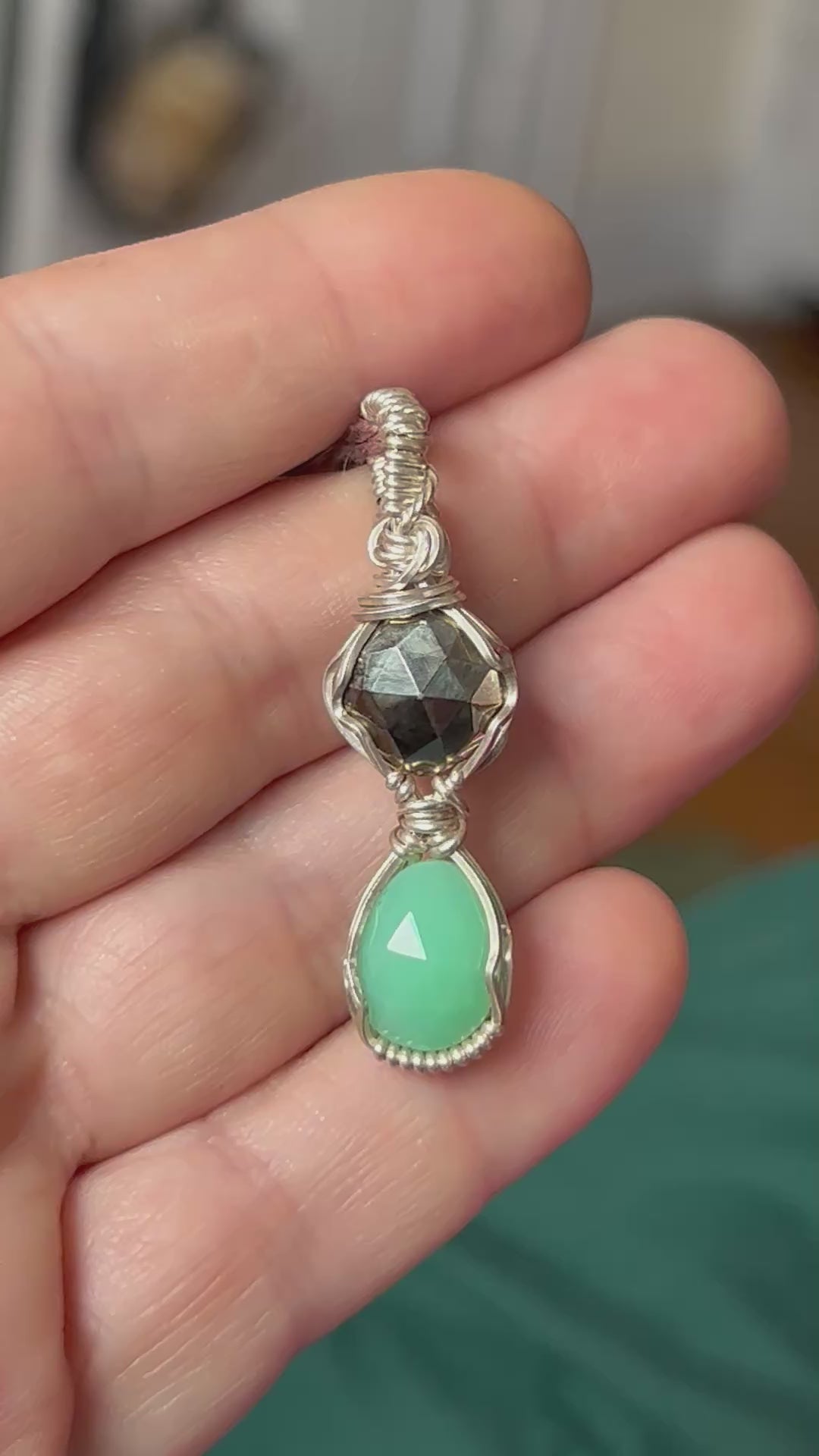 Create a luxurious and eye-catching look with my cascading pendant, adorned with beautifully cut Pyrite and Chrysoprase stones wrapped in sterling silver. Pyrite is known for its ability to attract abundance and good fortune, while Chrysoprase is believed to assist in the healing and opening of emotional wounds.