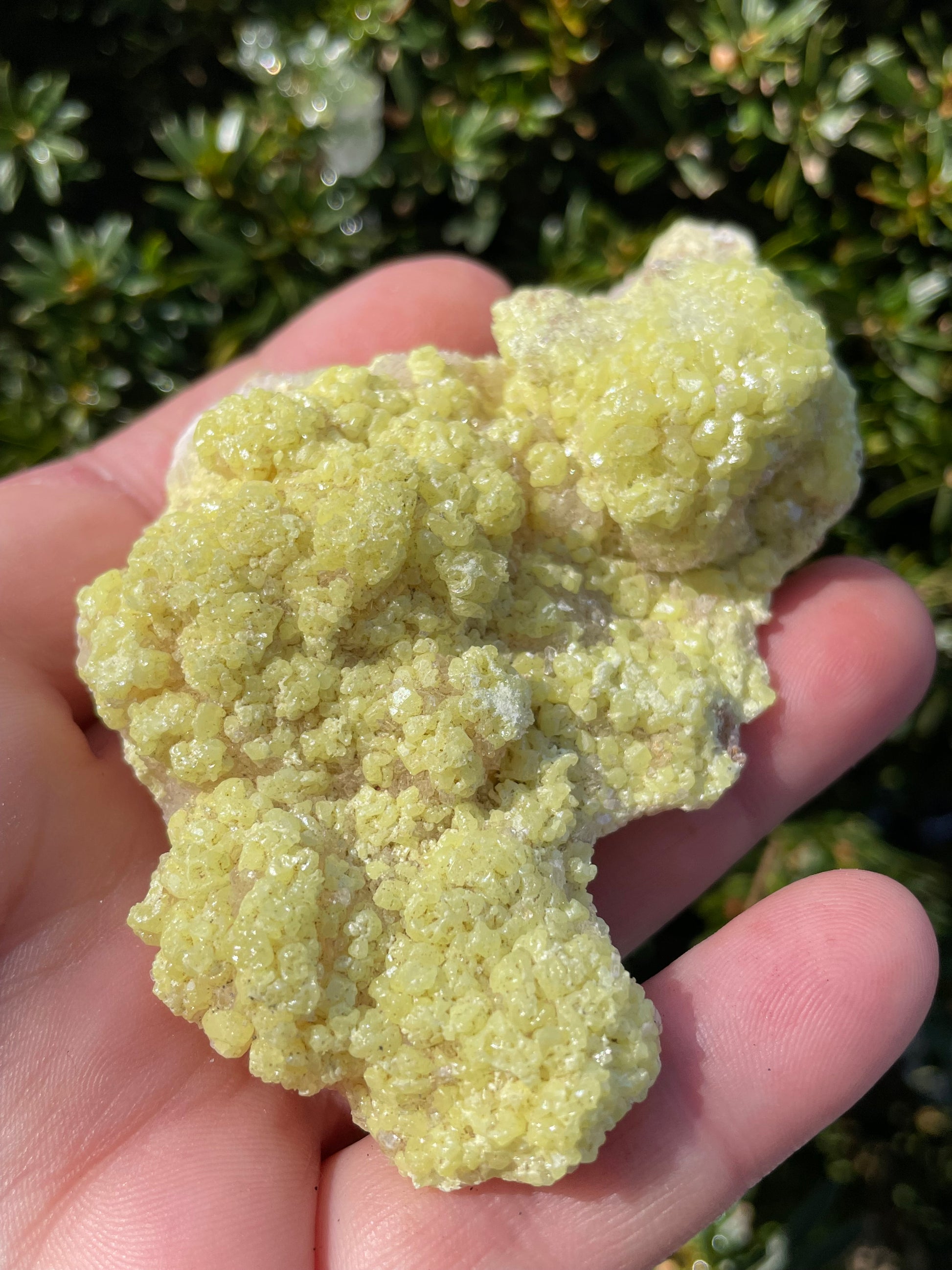 Sulfur crystals are unique, bright yellow, and smelly crystal. This definitely is a super unique piece to add to anyone's collection.