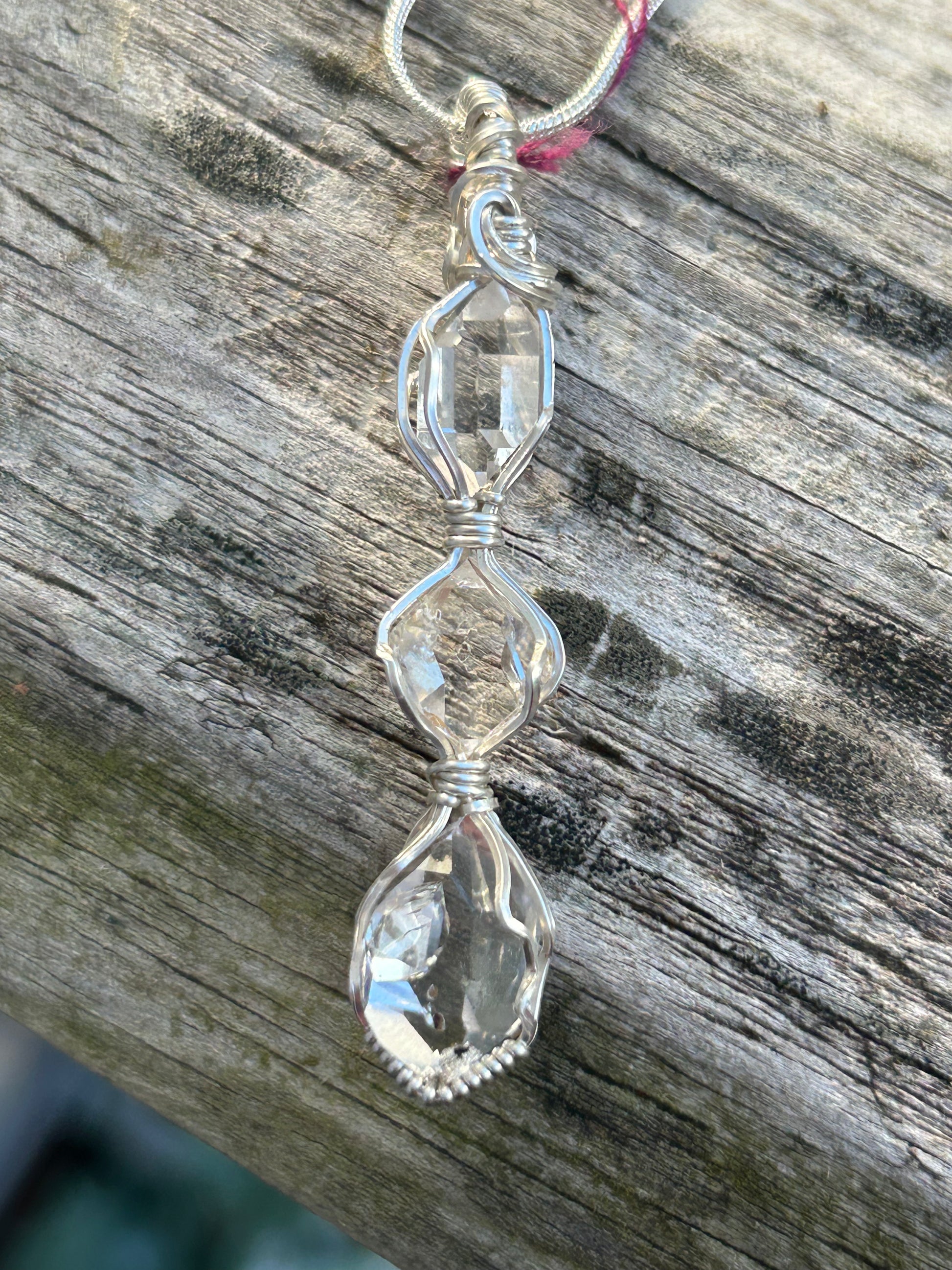 Benefit from the natural beauty and powerful energy with these self collected crystals from Upstate New York. This triple Herkimer diamond pendant is crafted with sterling silver wire, adding an elegant touch to these stunning water clear stones. Each pendant comes with a 20 inch silver-plated snake chain for easy wear and display. Discover the magic of these favorite crystals today.